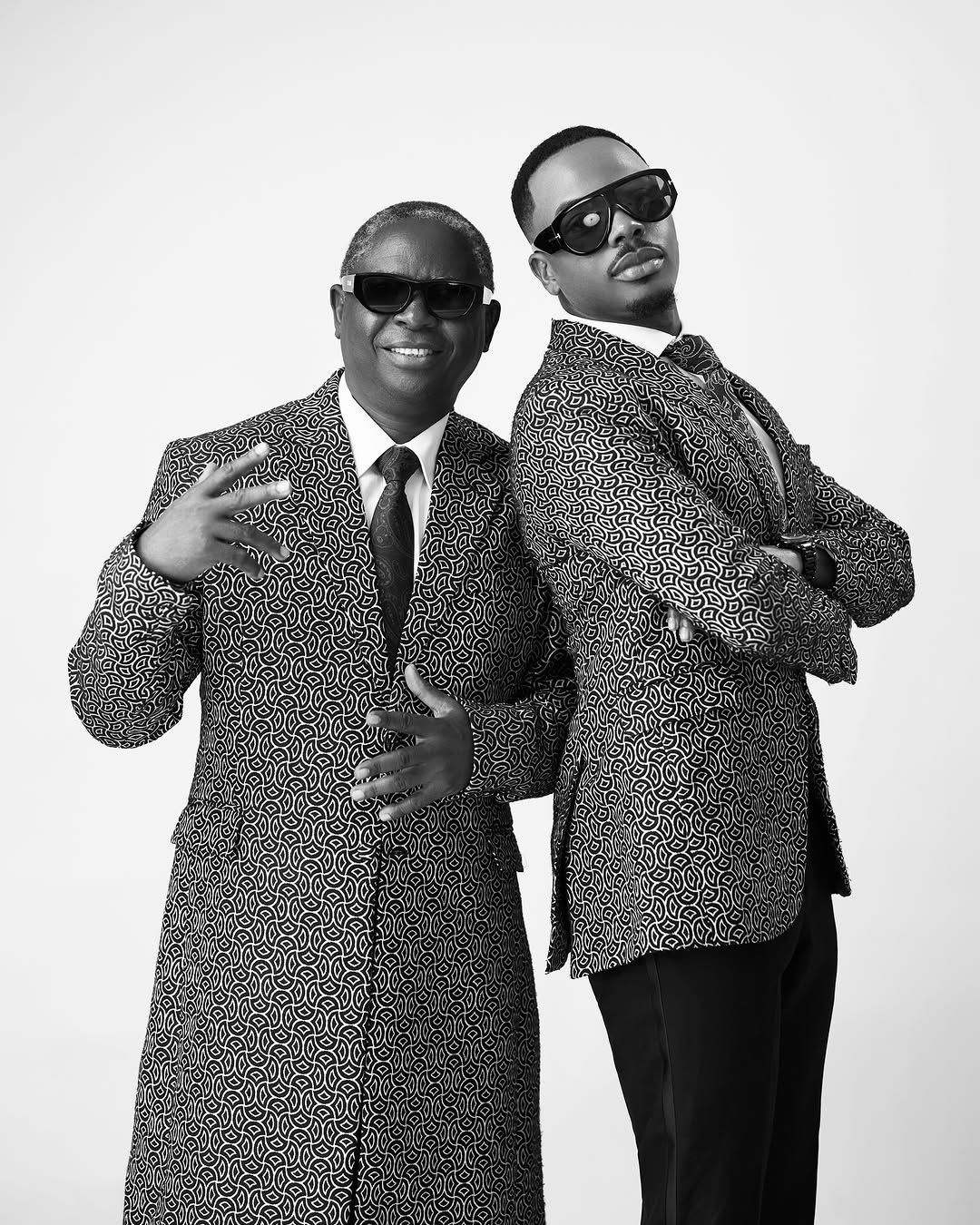 In another post, they switch it up with a striking black-and-white photoshoot. This time, they’re wearing classic white shirts, black trousers, and ties, sitting on a bench and ready for a friendly game of ayo. In another frame, they add matching jackets and dark sunglasses, giving us “father-and-son action duo” vibes—like a movie scene where they’re gearing up to take down the bad guys.