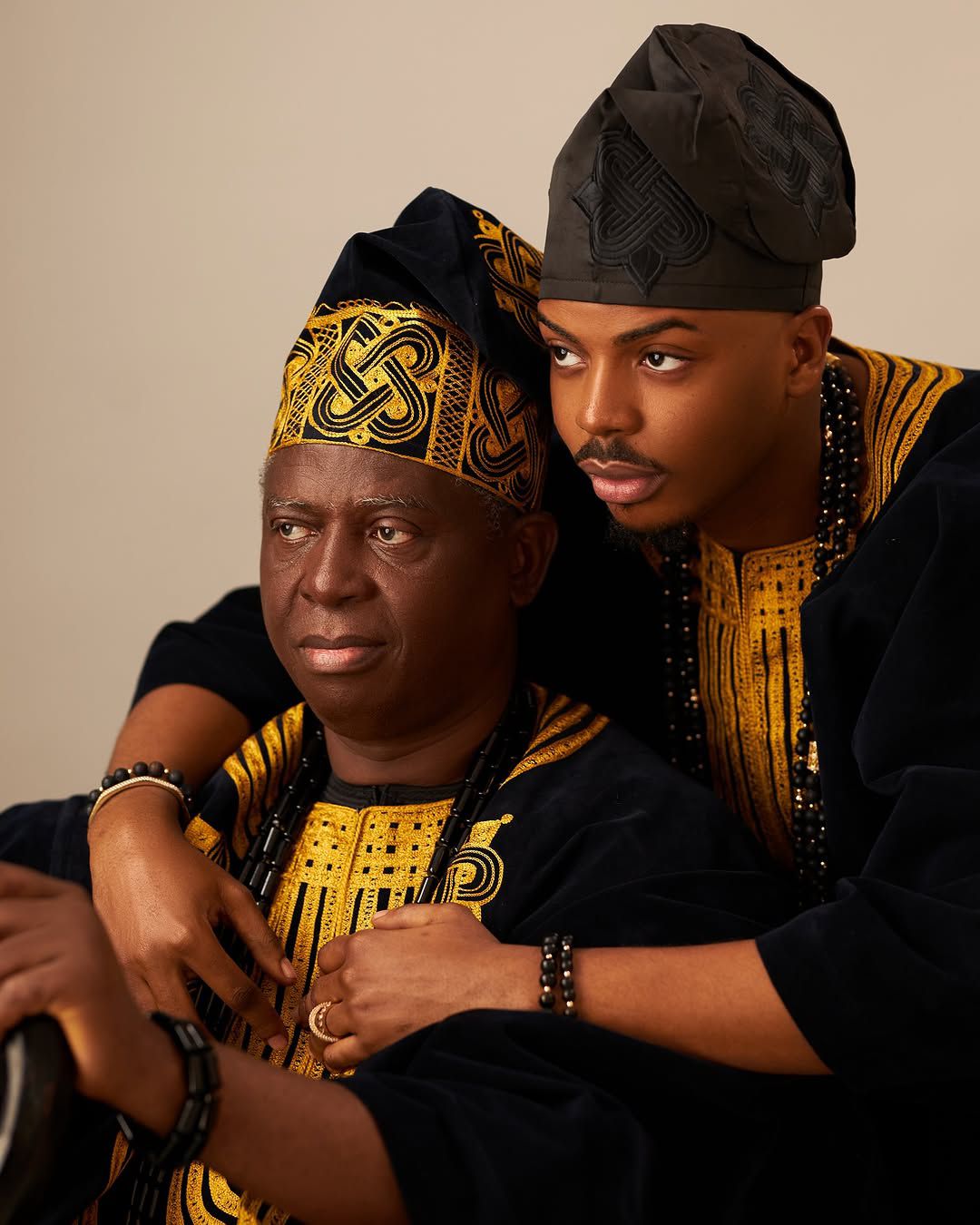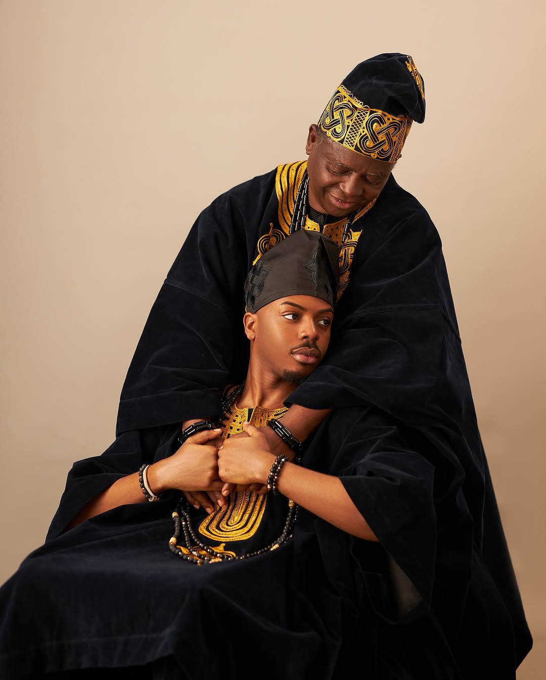 In one post, Enioluwa and his dad are twinning in matching traditional Yoruba attire. Both are dressed in black velvet agbadas with beautiful gold embroidery, paired with matching black caps and walking sticks. It’s the ultimate display of Yoruba elegance and gentlemanly charm.